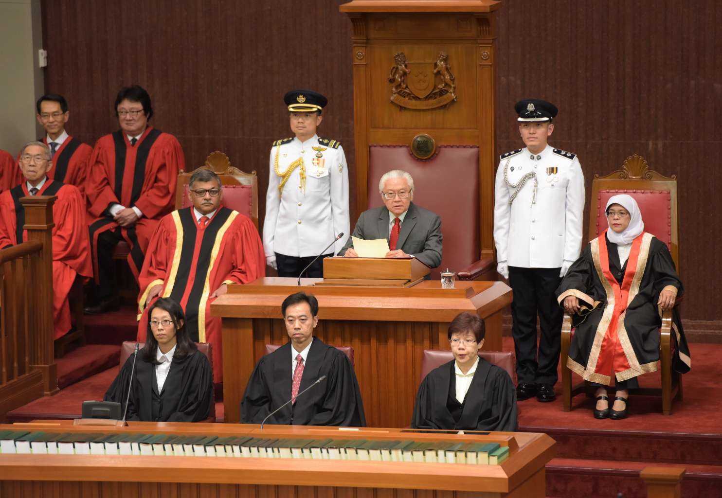 President Tony Tan Keng Yam opening the first session of the 13th Parliament, flanked by Chief Justice Sundaresh Menon and Speaker of Parliament Halimah Yacob.