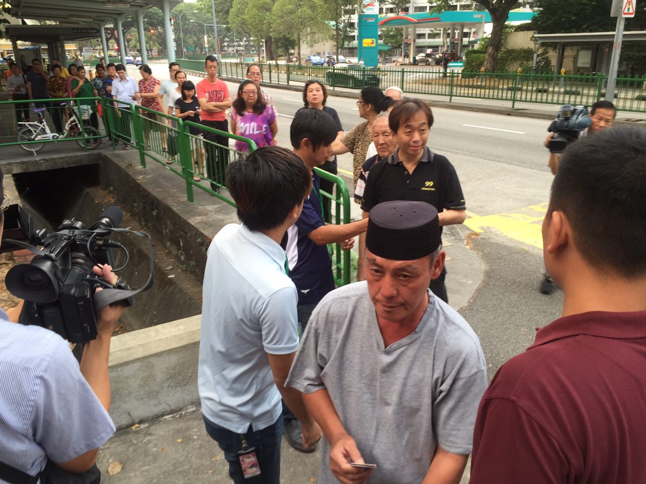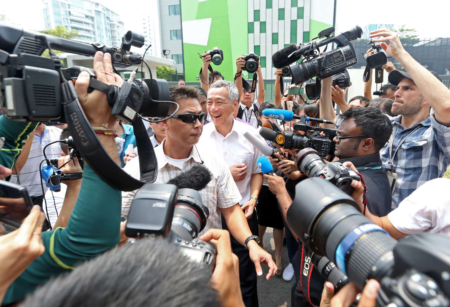 PM Lee Hsien Loong is surrounded by the media as he leaves Alexandra Primary School after casting his vote.
