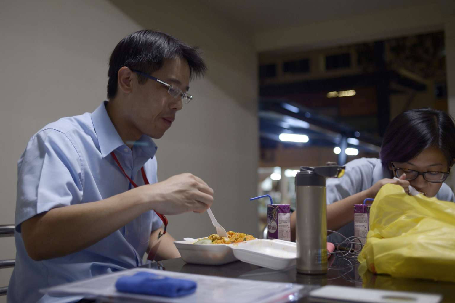 Workers' Party candidate for East Coast GRC Gerald Giam having his dinner at a void deck in Simei Street 1 after delivering food to polling agents at a nearby polling station.