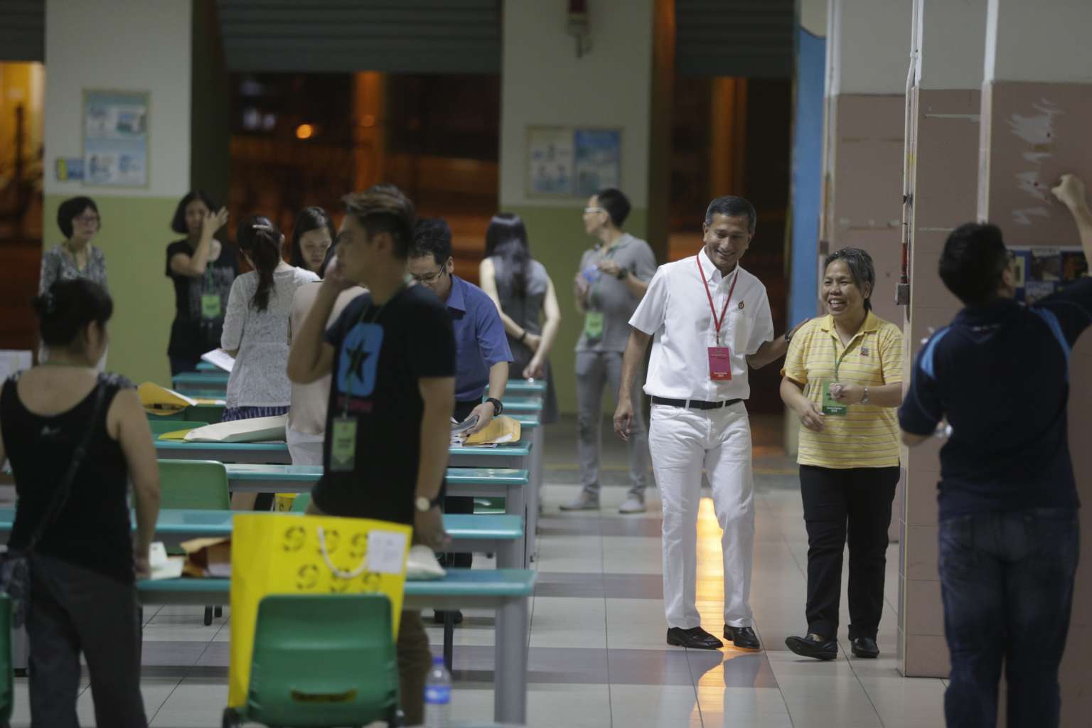 People's Action Party candidate for Holland-Bukit Timah GRC Dr Vivian Balakrishnan at Bukit Panjang Primary School as polling closes at 8pm.