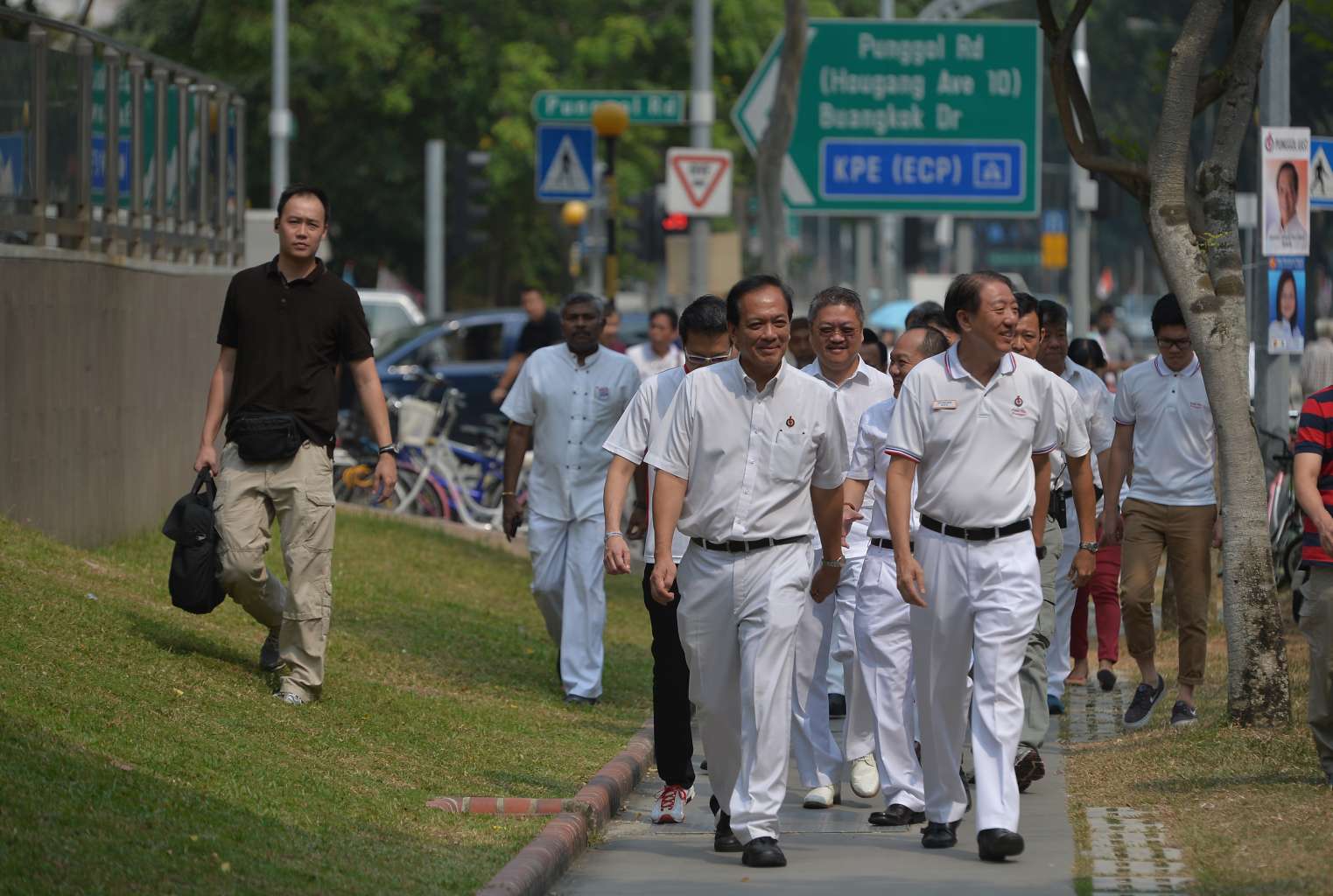 DPM Teo Chee Hean (front, right) and Punggol East SMC candidate Charles Chong (front, left) walking to Rivervale Plaza with other PAP members on Sept 6, 2015.