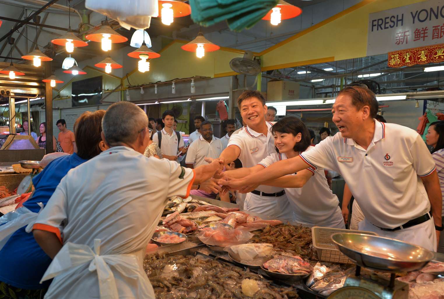 PAP Pasir Ris Punggol GRC candidates (from right) DPM Teo Chee Hean, Sun Xueling and Ng Chee Meng meeting stallholders at the wet market in Punggol Plaza on Sept 6, 2015.