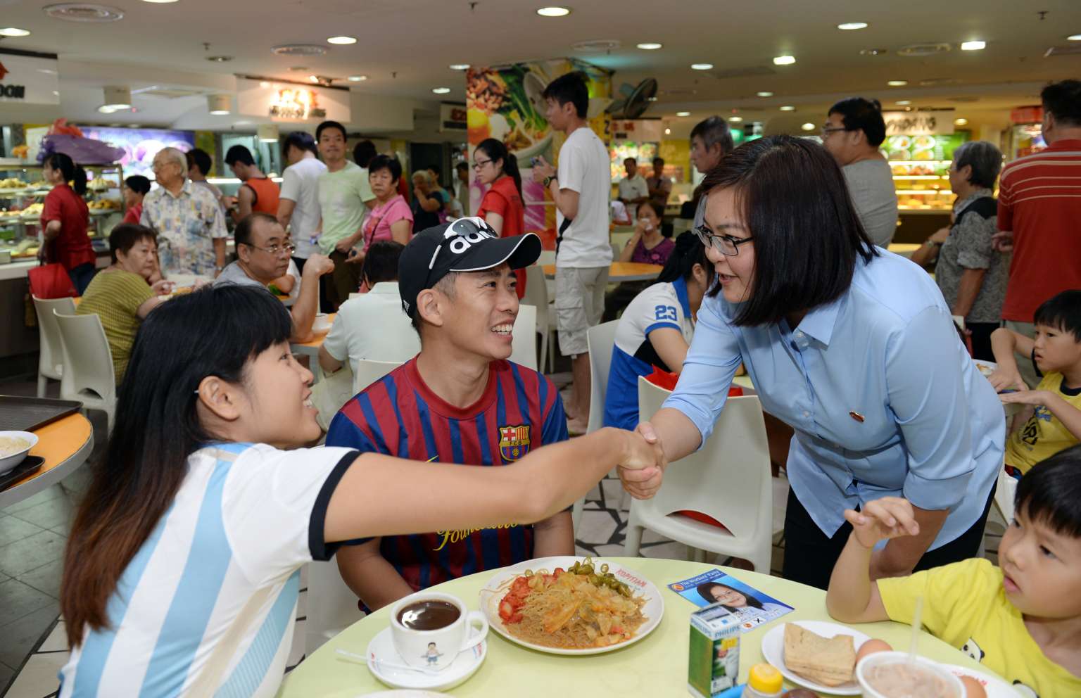 Candidate for Punggol East SMC Lee Li Lian shaking hands with members of a family having their breakfast at a food court in Rivervale Plaza on Sunday morning.