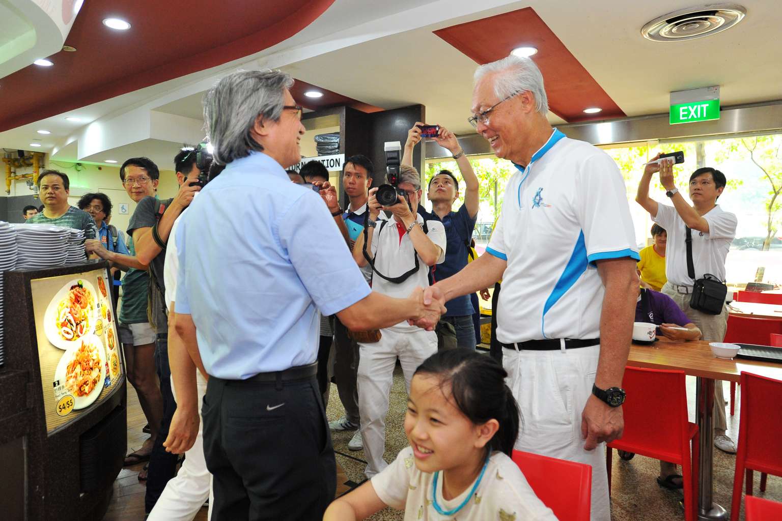 Workers' Party Aljunied GRC candidate Chen Show Mao (left) shaking hands with ESM Goh Chok Tong at the Hougang Central food court on Sept 6, 2015.