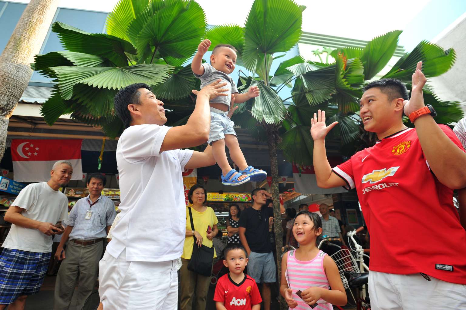 PAP Marine Parade GRC candidate Tan Chuan-Jin (in white) playing with 19-month-old Gyven Lim while the child's father, F&B manager Vincent Lim (right), 34, watches, at Marine Terrace on Sept 6, 2015.