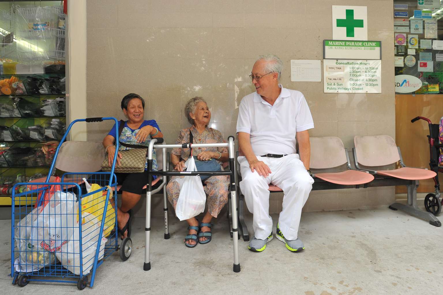 ESM Goh Chok Tong with Madam Tan Cheng Siew (left), 68, and Madam Ong Kim Phong, 89, at Marine Crescent on Sept 6, 2015.