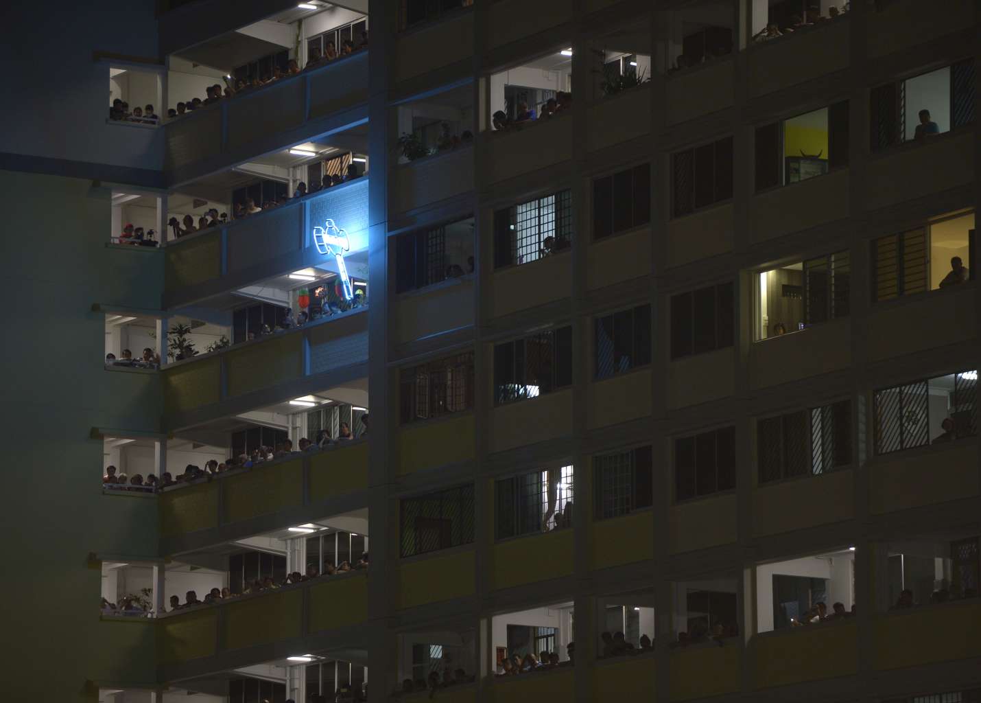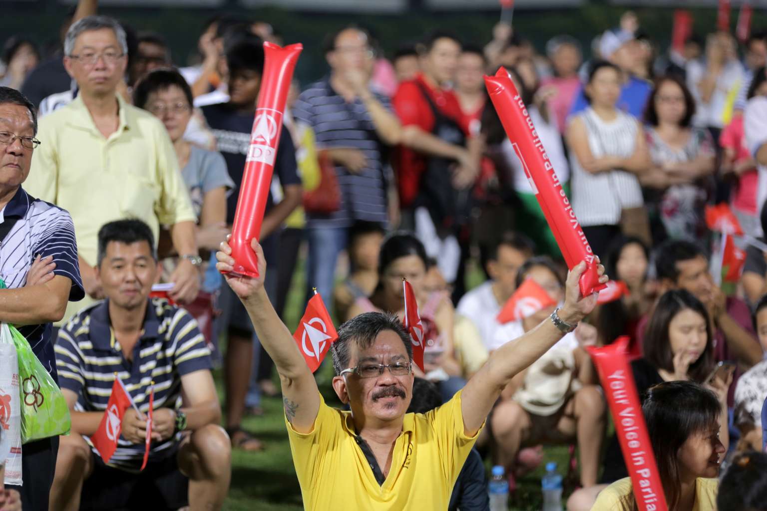 Residents watching the Workers' Party rally at the field in front of Block 155, Simei Road. The WP candidates running in East Coast GRC are Mr Gerald Giam, Mr Daniel Goh, Mr Leon Perera and Mr Mohamed Fairoz Shariff.