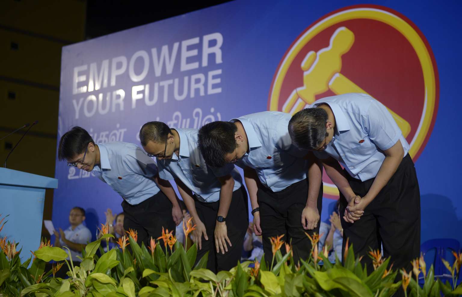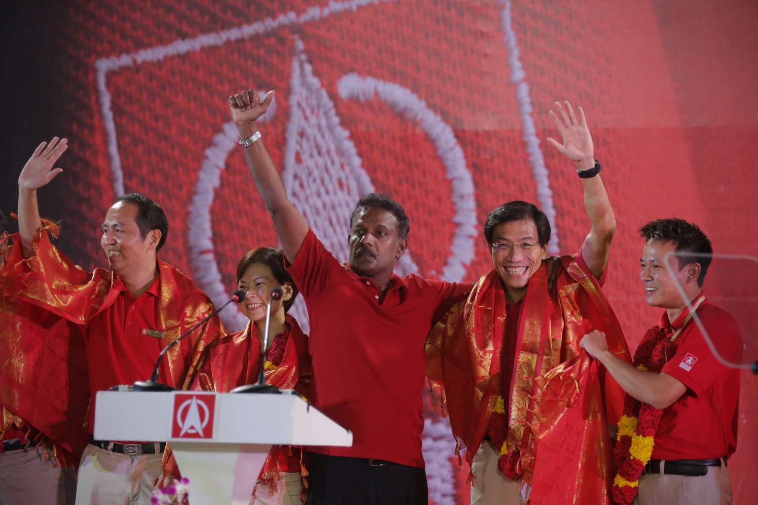 Singapore Democratic Party (SDP) candidates cheering at the end of the rally for Yuhua SMC electoral division at Jurong East Stadium in Jurong East Street 31.