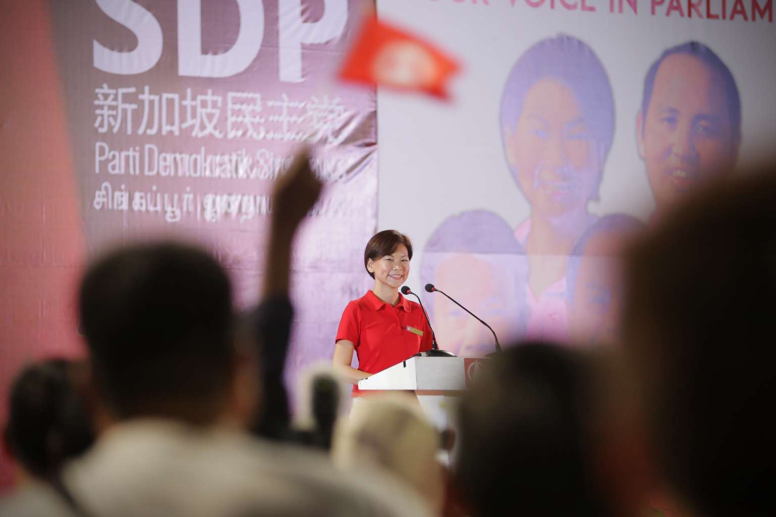 Singapore Democratic Party's (SDP) Jaslyn Go speaking at a rally for the Yuhua SMC electoral division at Jurong East Stadium.