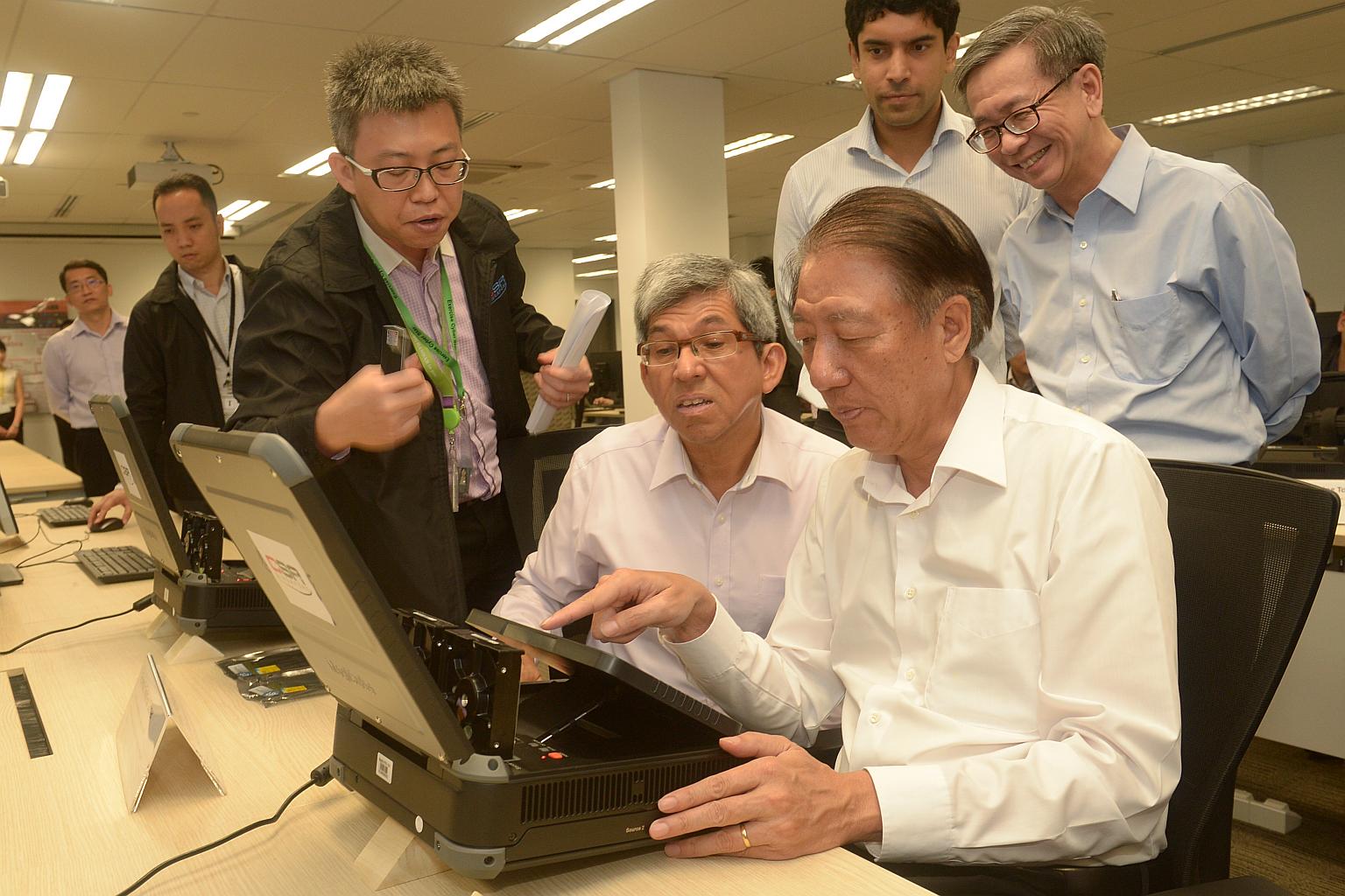DPM and Coordinating Minister for National Security Teo Chee Hean (right, seated) and MCI Minister Dr Yaacob Ibrahim (second from right), at the Cyber Security Agency of Singapore (CSA) first multi-sector exercise, Exercise Cyber Star 2016, on March 22, 2016.