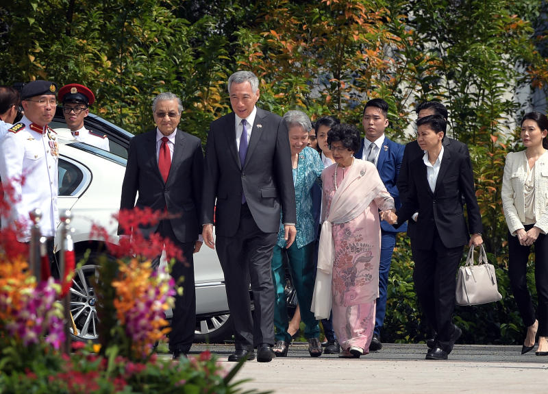 Malaysian Prime Minister Mahathir Mohamad and his wife Siti Hasmah Mohamad Ali being accompanied by Prime Minister Lee Hsien Loong and Mrs Lee on their arrival at the Istana during his visit to Singapore on Nov 12, 2018.