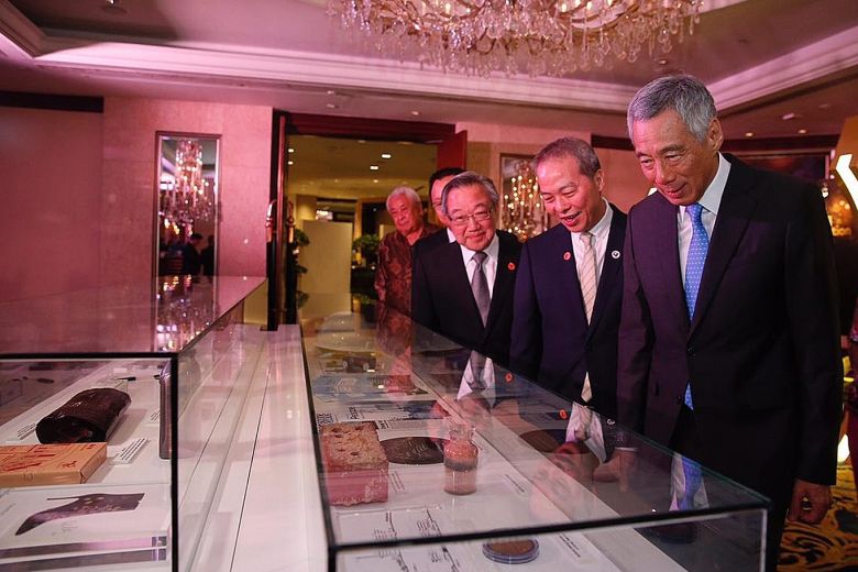Prime Minister Lee Hsien Loong viewing the items of a time capsule that will be placed on June 1 in JTC's first permanent headquarters at Jurong Town Hall. With him are (from left) Datuk Seri Lim Chong Keat, architect of the original Jurong Town Hall; Senior Parliamentary Secretary for Trade and Industry Tan Wu Meng; JTC chairman Loo Choon Yong and its CEO Ng Lang.