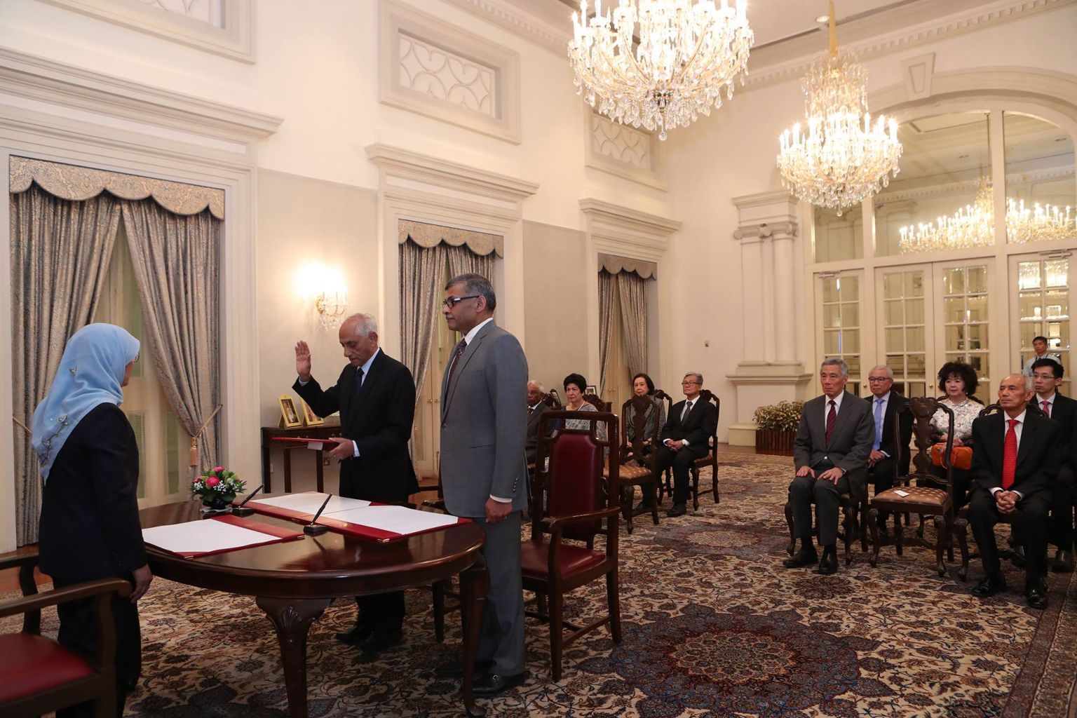 SINGAPORE - Mr J Y Pillay was sworn in as chairman of the Council of Presidential Advisers (CPA) on Thursday (Sept 28), in a ceremony at the Istana witnessed by President Halimah Yacob, Prime Minister Lee Hsien Loong and Chief Justice Sundaresh Menon.