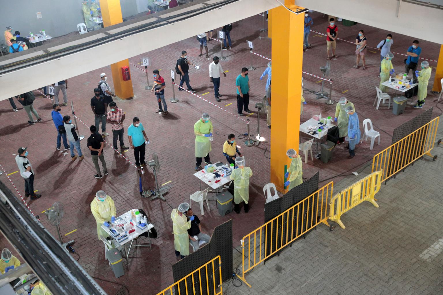 Essential workers being screened for Covid-19 at the regional screening centre at Marina Bay on June 9, 2020.