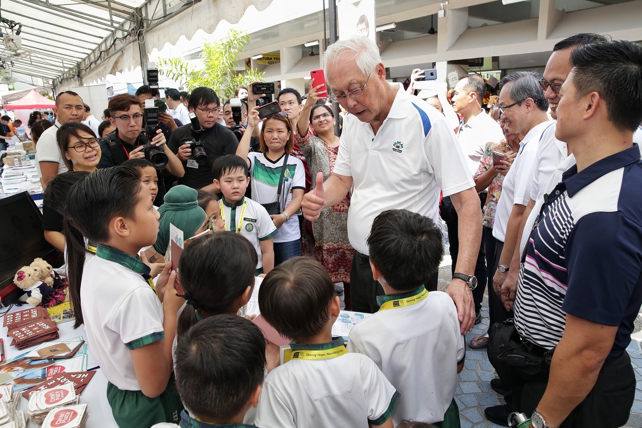 In this photo from May 12, 2019, Emeritus Senior Minister Goh Chok Tong interacts with pupils from Tanjong Katong Primary School during the Marine Parade Town Carnival.