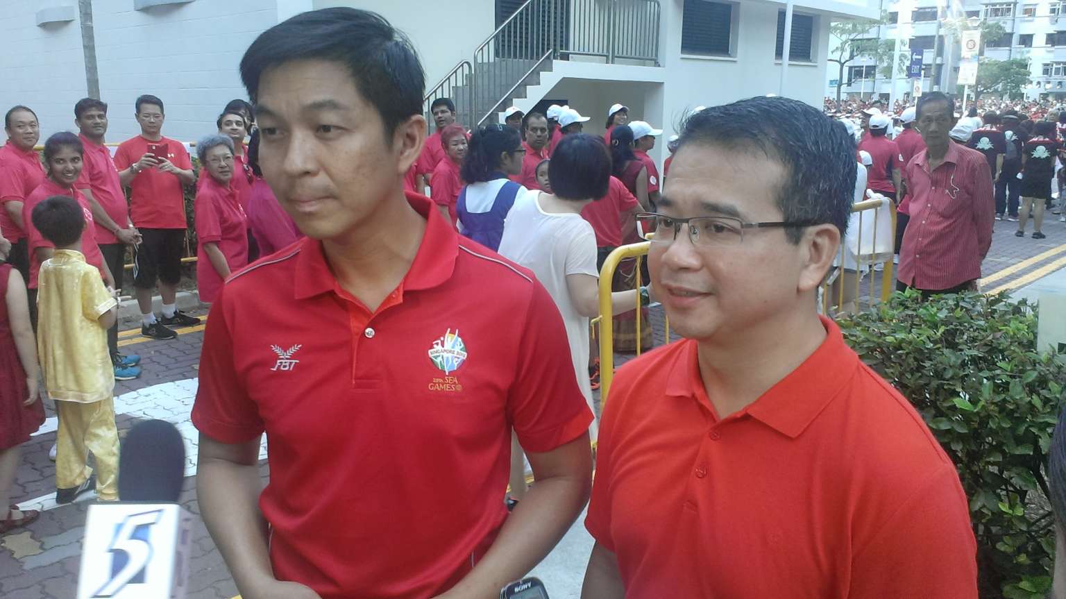 Current Moulmein-Kallang GRC MP Edwin Tong (right) with Minister for Social and Family Development and Marine Parade GRC MP Tan Chuan-Jin at a grassroots event in Marine Parade on Sunday, Aug 2, 2015.