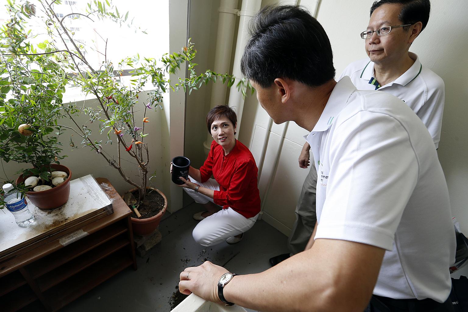 Senior Minister of State for Finance and Transport and Bishan-Toa Payoh MP Josephine Teo visiting homes in Bishan North Street 22 on July 26, 2015 to update residents on the dengue situation in their neighbourhood.