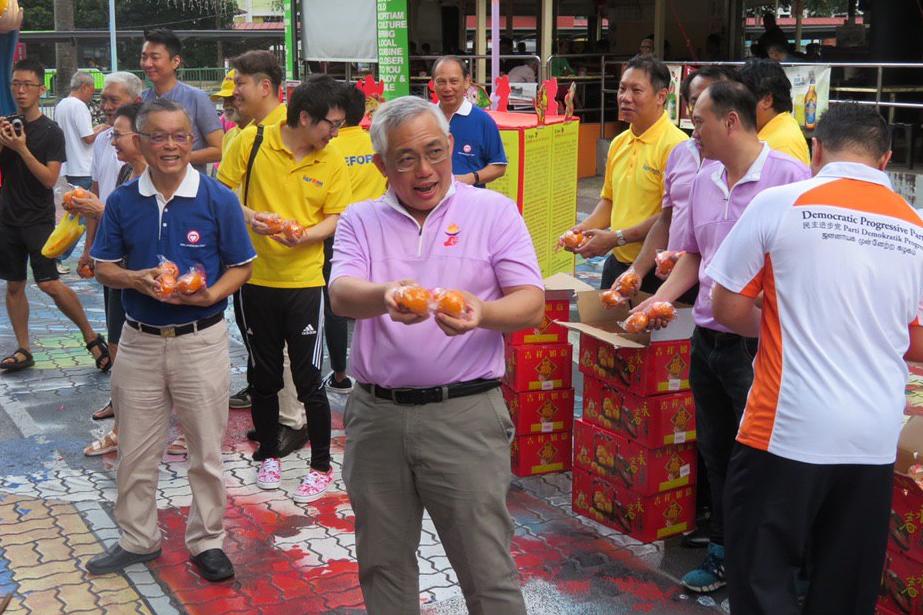 On Sunday morning, Mr Goh, Mr Tan Jee Say and 13 other members of the four parties in the group were at AMK Hub handing out oranges to residents.