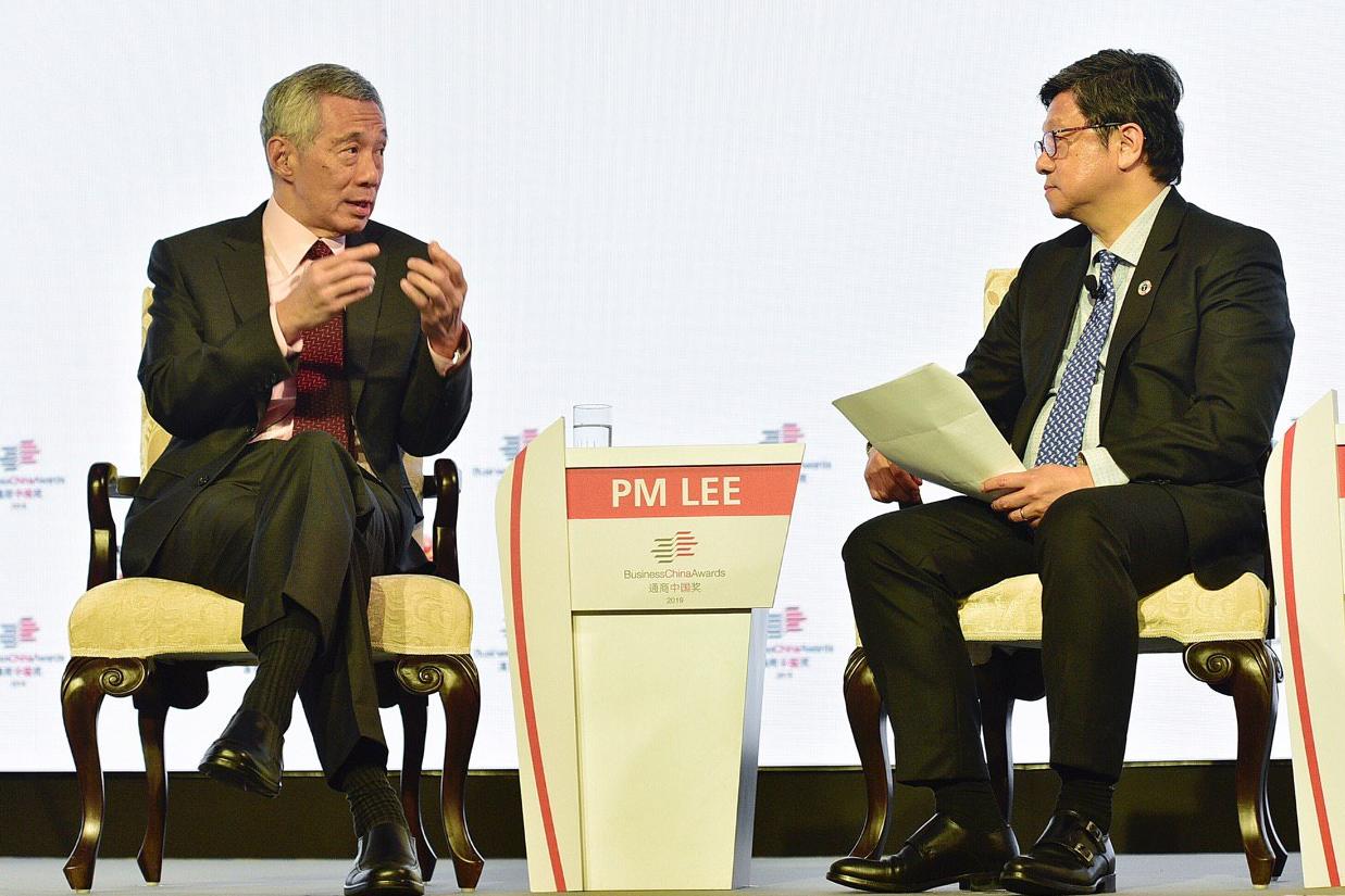 Prime Minister Lee Hsien Loong speaks with Business China director Robin Hu at a fireside chat at the Sands Expo and Convention Centre on June 7, 2019.