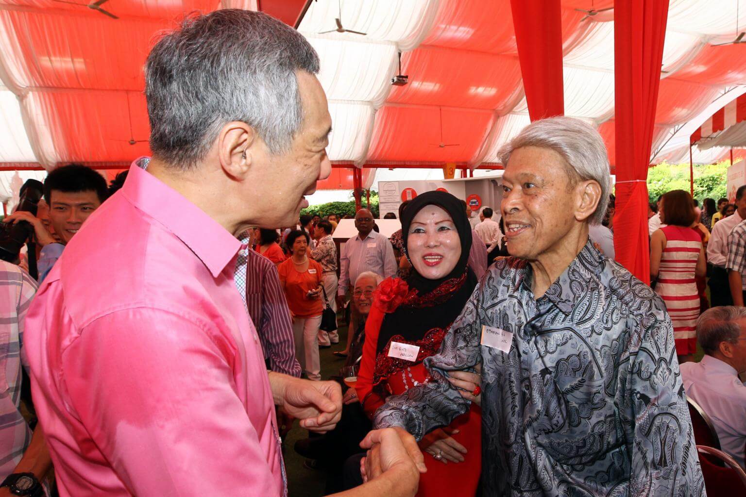 Prime Minister Lee Hsien Loong (left) shaking hands with former cabinet minister Othman Wok at the Pioneer Generation Tribute ceremony in 2014.