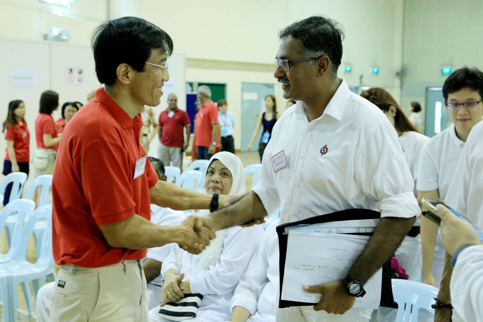 Singapore Democratic Party's Chee Soon Juan (left) and the People's Action Party's Murali Pillai met briefly on Nomination Day (April 27) as they filed their papers.