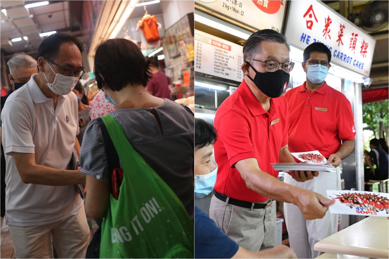 PAP's Liang Eng Hwa (left) at Bangkit Market on July 4, 2020, and SDP's Tan Jee Say (second from right) and James Gomez meet residents at Bukit Timah Market and Food Centre on July 1, 2020.
