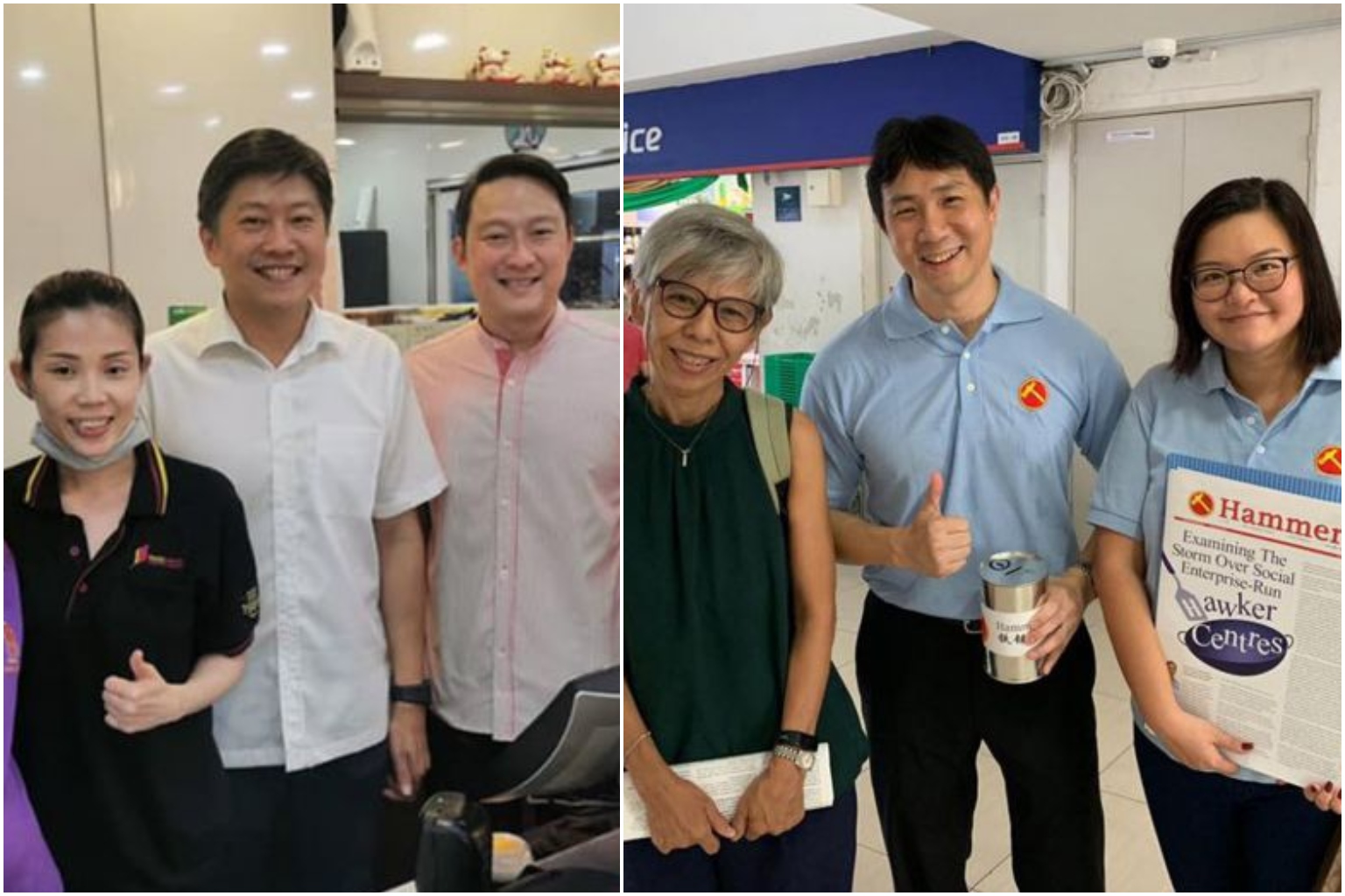 Labour chief Ng Chee Meng (in white) and Senior Minister of State for Transport and Health Lam Pin Min seen with employees of a shop in Sengkang, while former Punggol East MP Lee Li Lian (right) and Dr Jamus Lim both seen here with a resident.