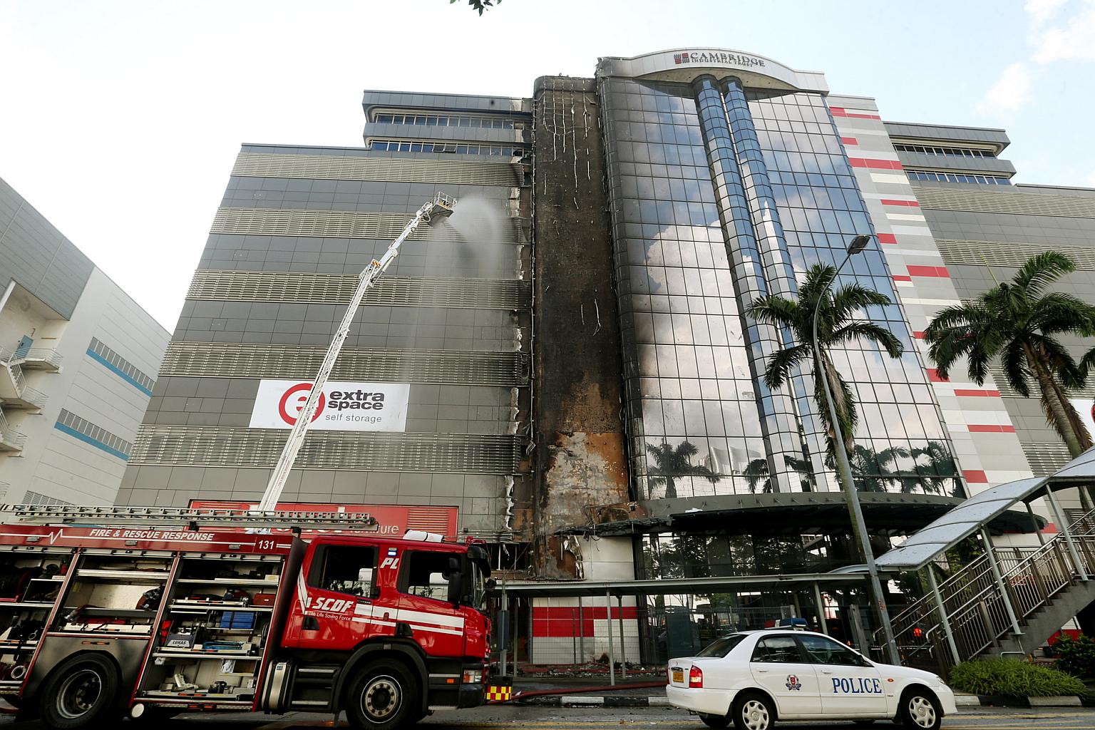 SCDF officers putting out a fire that broke out on the facade of the building at 30 Toh Guan Road on May 4, 2017.