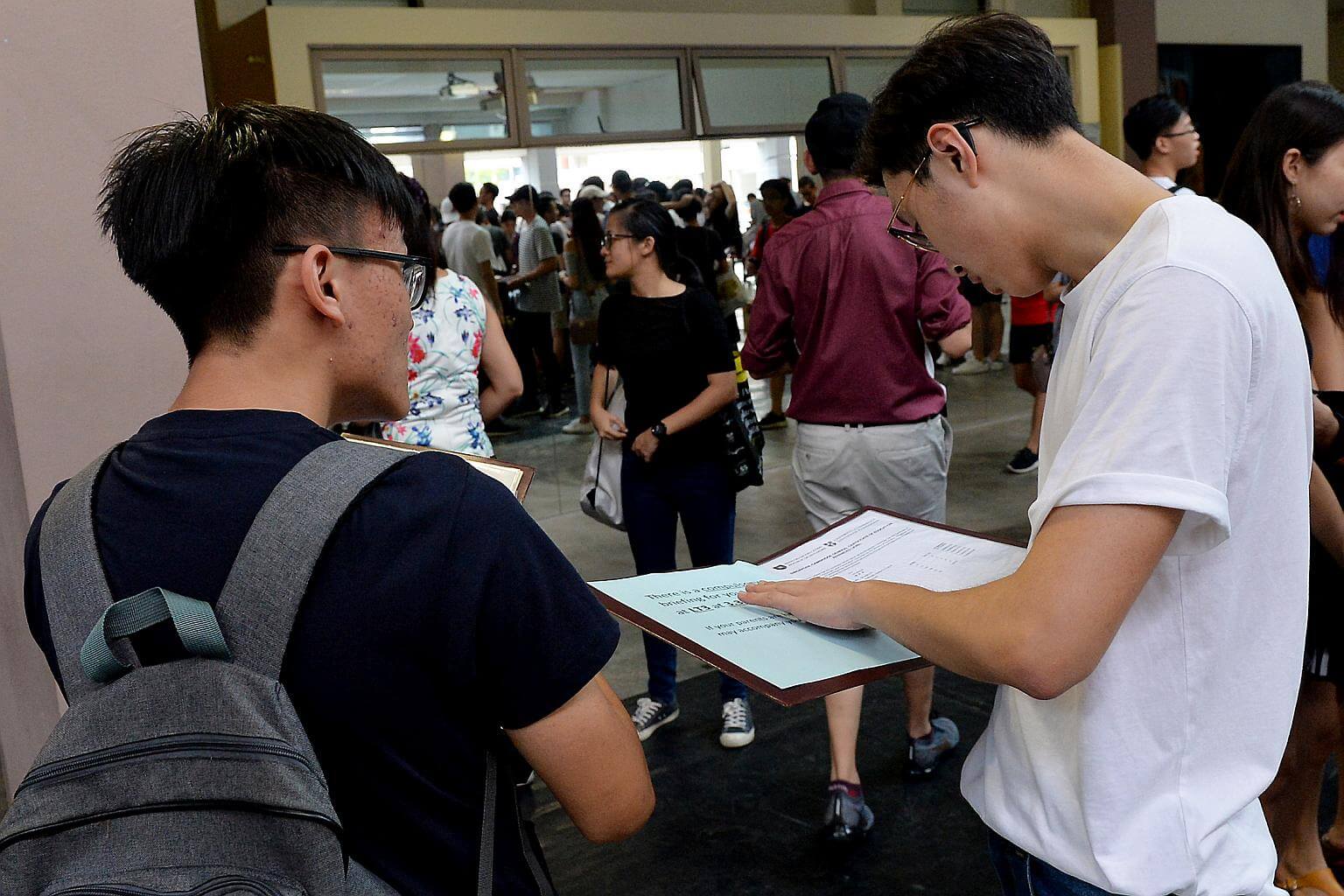 Students collecting their A-level results at Nanyang Junior College. Candidates whose examination scripts were stolen in Britain last November were given a blue slip in their results file.
