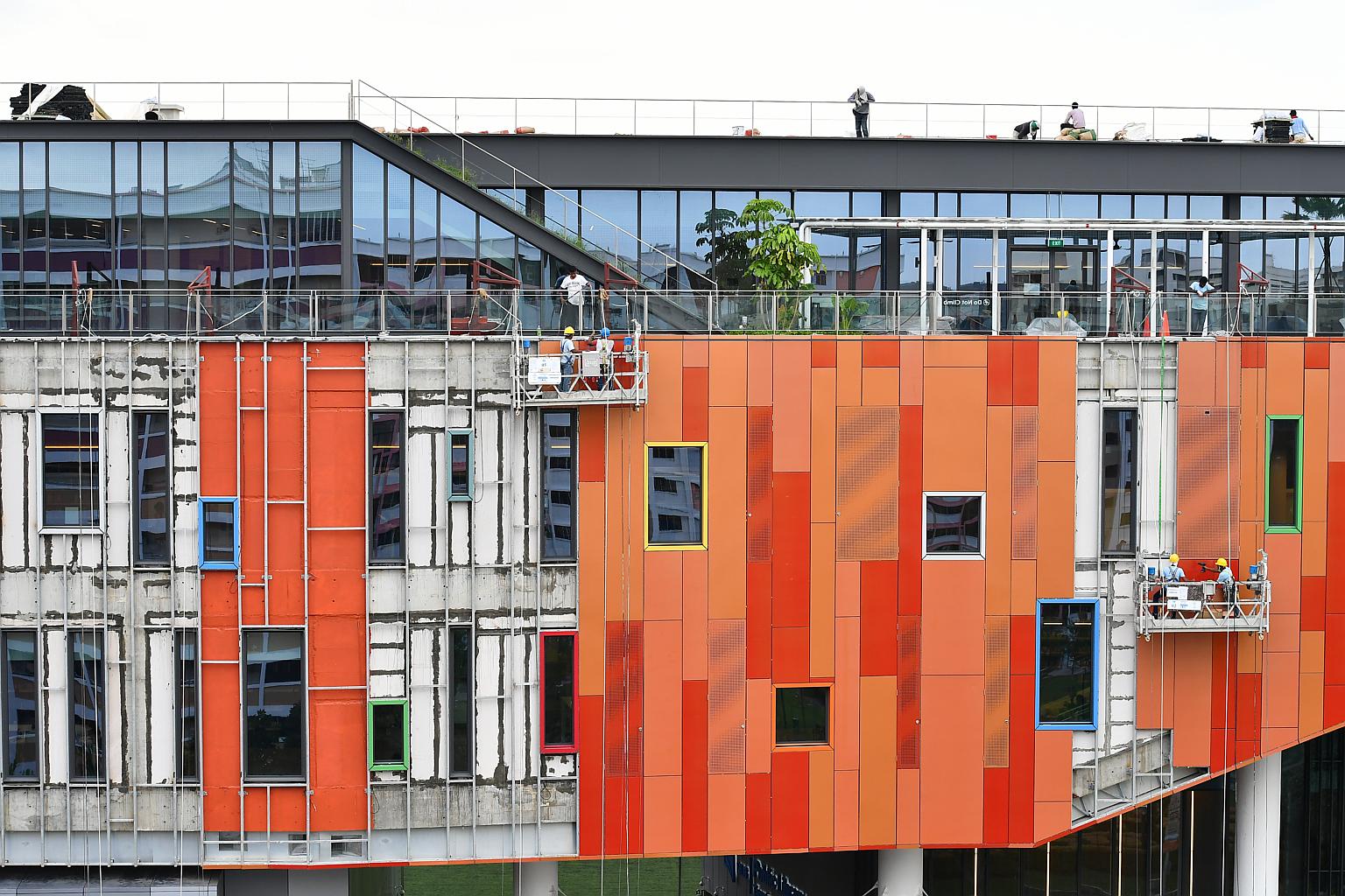 Workers removing cladding from Our Tampines Hub on Sept 14, 2017, after it was found that the project had external cladding panels that did not comply with safety standards.