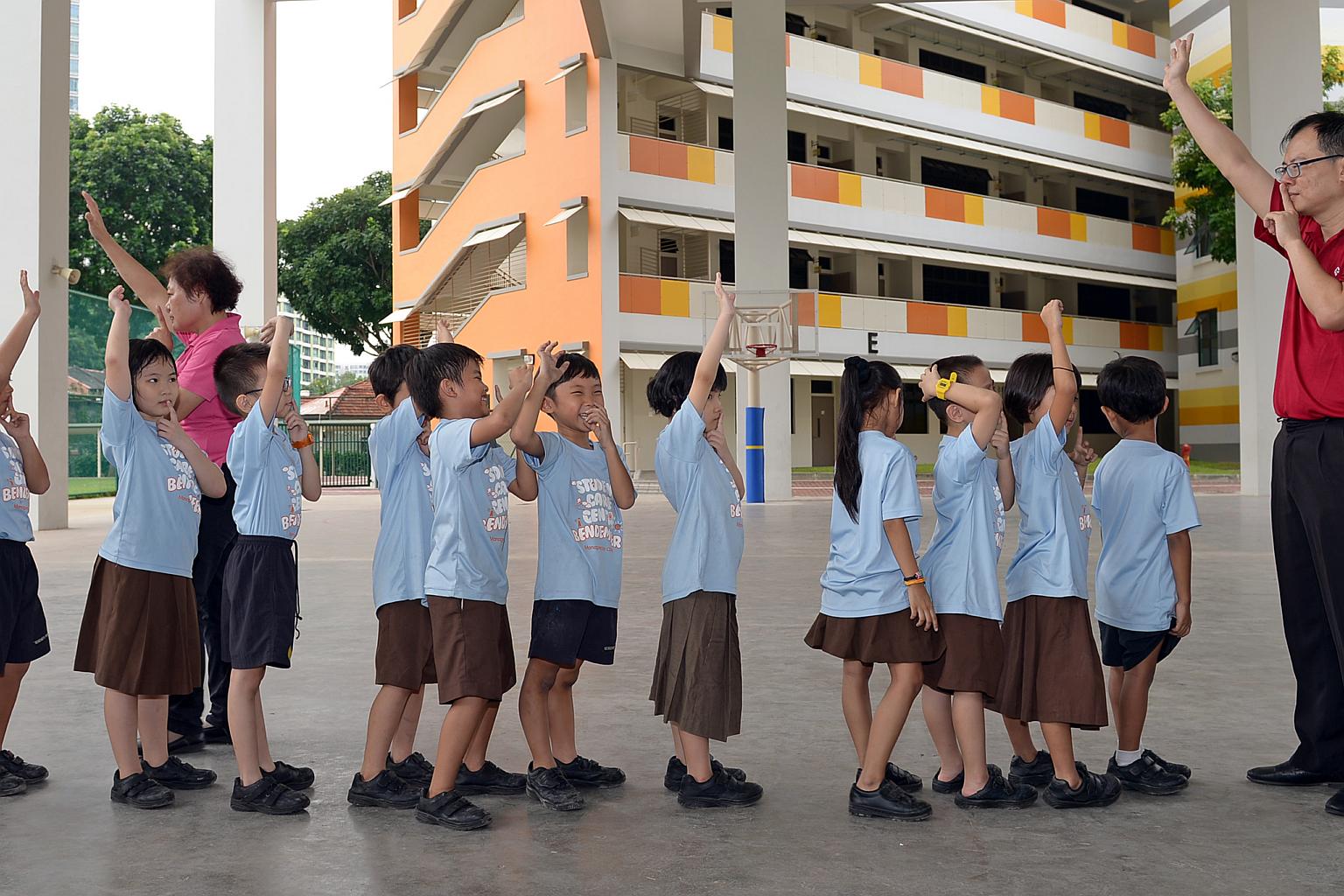 Primary 1 pupils with student-care teachers at Bendemeer Primary School. Education Minister (Schools) Ng Chee Meng said in Parliament on Feb 5, 2018, that 9 per cent of all primary school pupils were enrolled in such school-based student care centres.