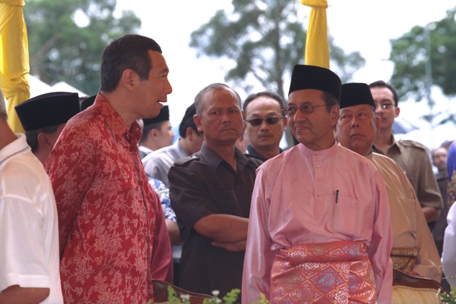 Prime Minister Lee Hsien Loong with his Malaysian counterpart Mahathir Mohamad at the Hari Raya Open House in Johor Baru in December 2001.
