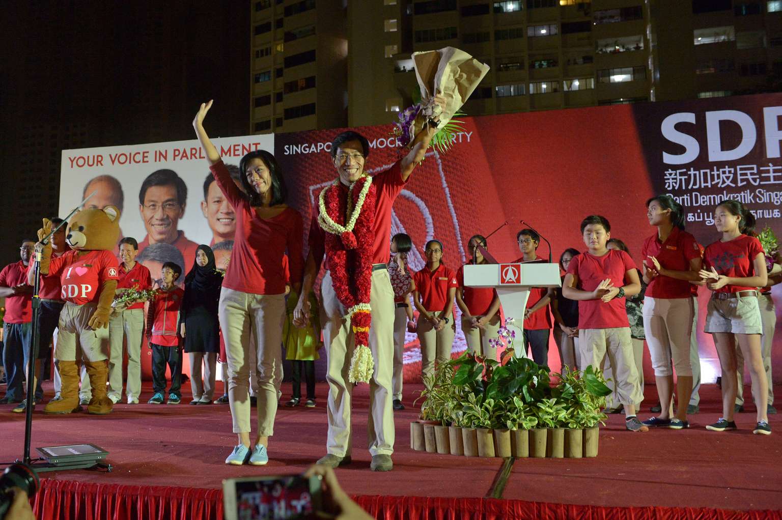 SDP chief Chee Soon Juan and his wife Huang Chih-mei waving to the crowd after the party’s rally in Clementi Avenue 6. Dr Chee urged voters to send him to Parliament to “make the ministers work harder for you”.