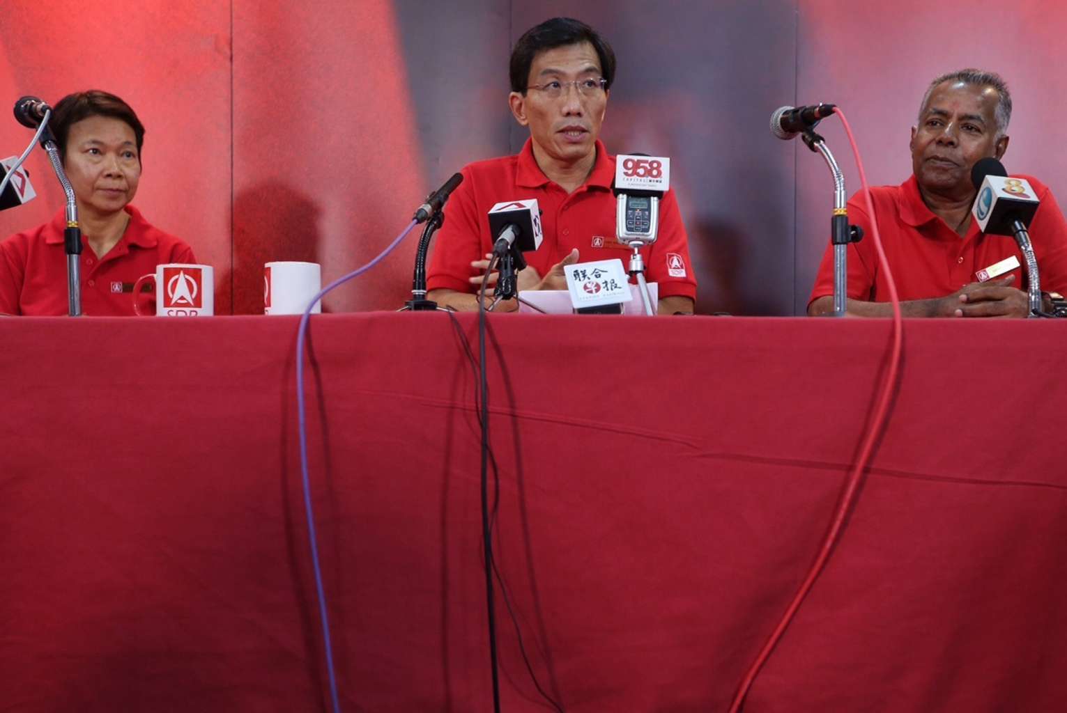 SDP secretary-general Chee Soon Juan (centre) and the party's 2015 General Election Bukit Batok SMC candidate Sadasivam Veriyah (right).