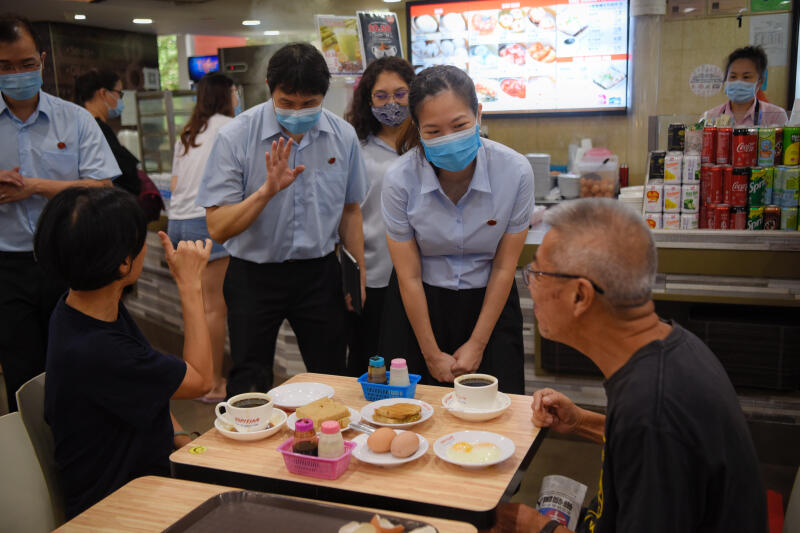 Sengkang MPs (from left) Louis Chua, Jamus Lim, Raeesah Khan and He Ting Ru chat with residents on July 12, 2020.