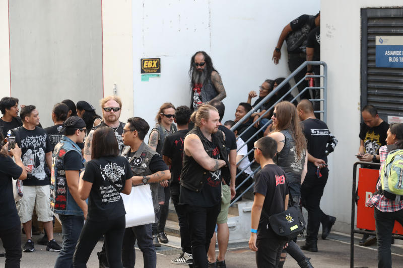 Swedish black metal band Watain mingling with fans on March 7, 2019, after their performance was cancelled.