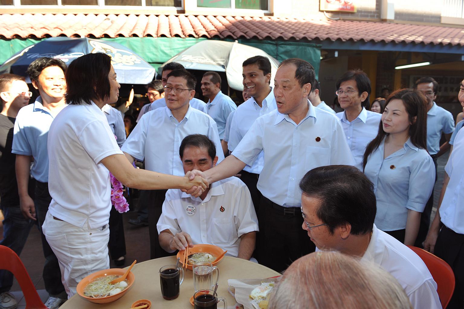 Workers’ Party chief Low Thia Khiang shaking hands with Ms Lee Bee Wah, one of the People's Action Party's (PAP) candidates for Nee Soon GRC, during a walkabout in Yishun Central on May 3, 2011.