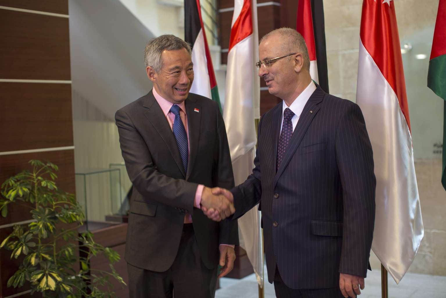 Palestinian Prime Minister Rami Hamdallah (right) shakes hands with Singapore Prime Minister Lee Hsien Loong during his visit to the West Bank town of Ramallah on April 20, 2016.