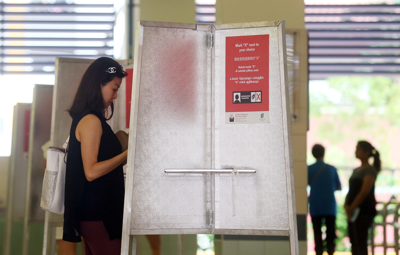 A photo taken on Sept 11, 2015, showing a woman casting her vote at Teck Ghee Primary School.