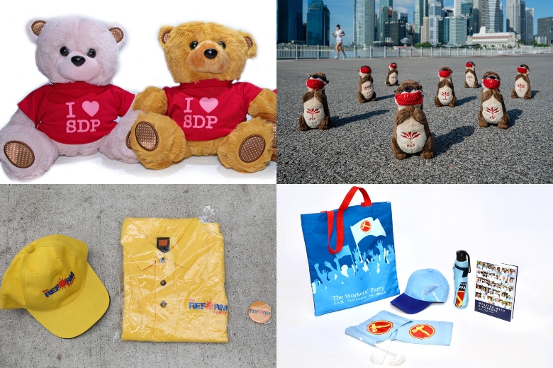 Merchandise sold by (clockwise from top left) the Singapore Democratic Party, Progress Singapore Party, Workers' Party and Reform Party.