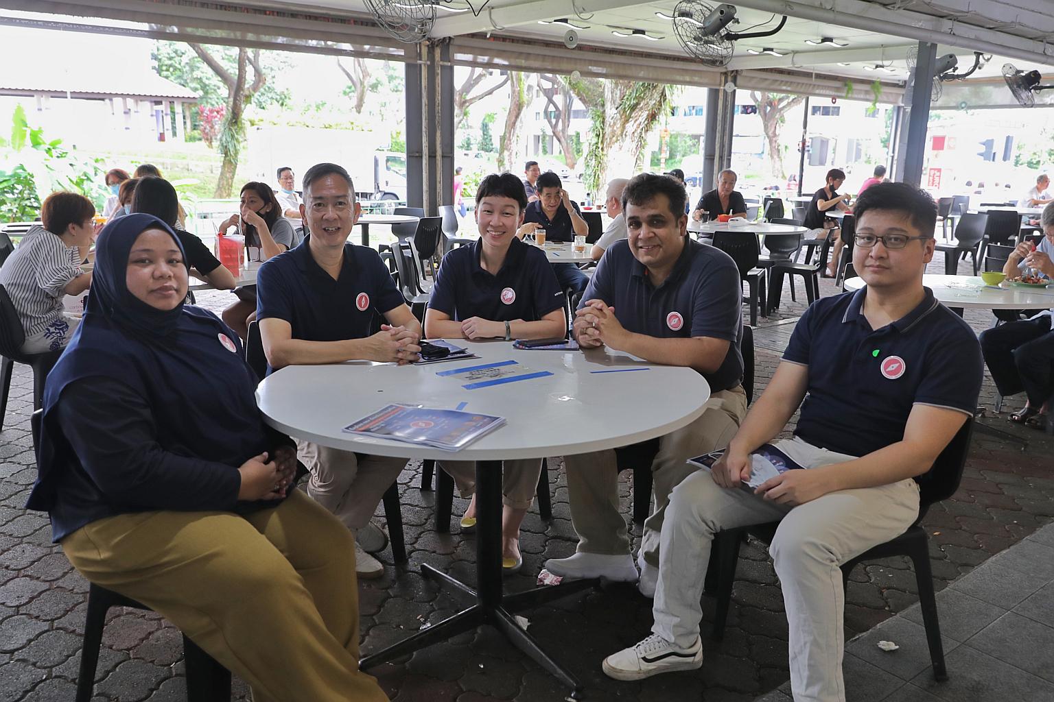 (From left) Red Dot United members Liyana Dhamirah, Alec Tok Kim Yam, Michelle Lee, Ravi Philemon and Nicholas Tang at a coffee shop at Block 503 Jurong West Street 52, on June 28, 2020.