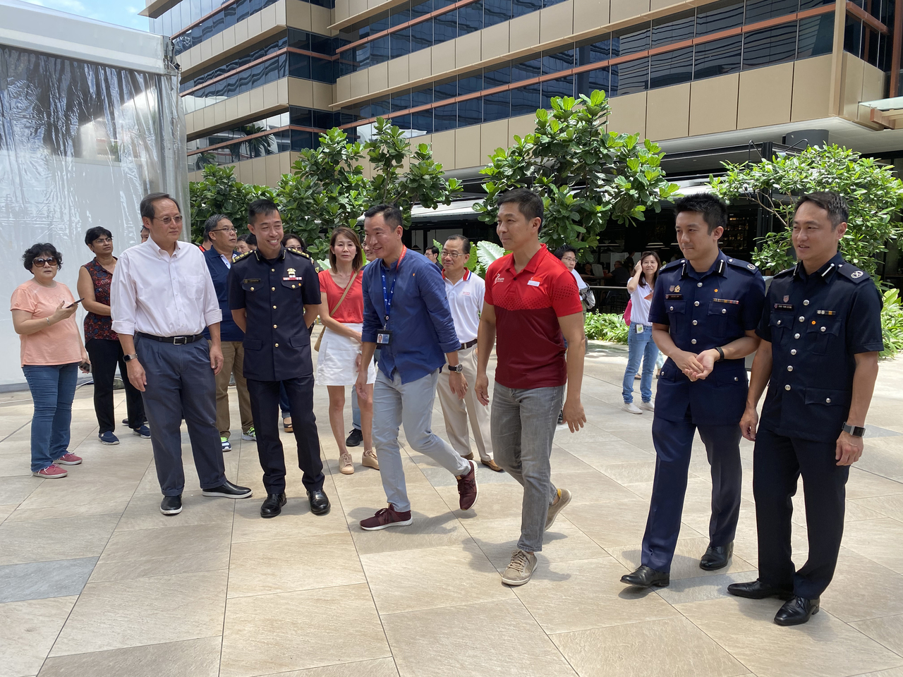 Speaker of Parliament Tan Chuan-Jin (third from right) arriving at an SGSecure roadshow outside the Paya Lebar Quarter mall on March 14, 2020.