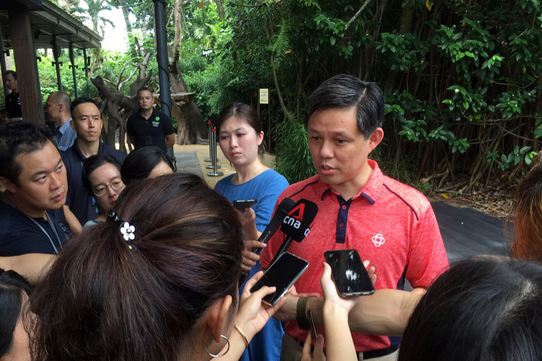 Trade and Industry Minister Chan Chun Sing speaking to reporters on the sidelines of an event at the Singapore Zoo on March 14, 2020.