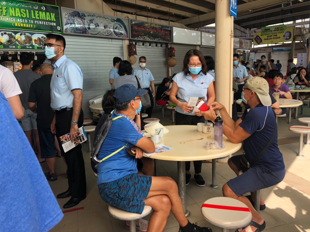 WP secretary-general Pritam Singh and chairman Sylvia Lim speaking with residents at Serangoon Garden Market & Food Centre on June 28, 2020.