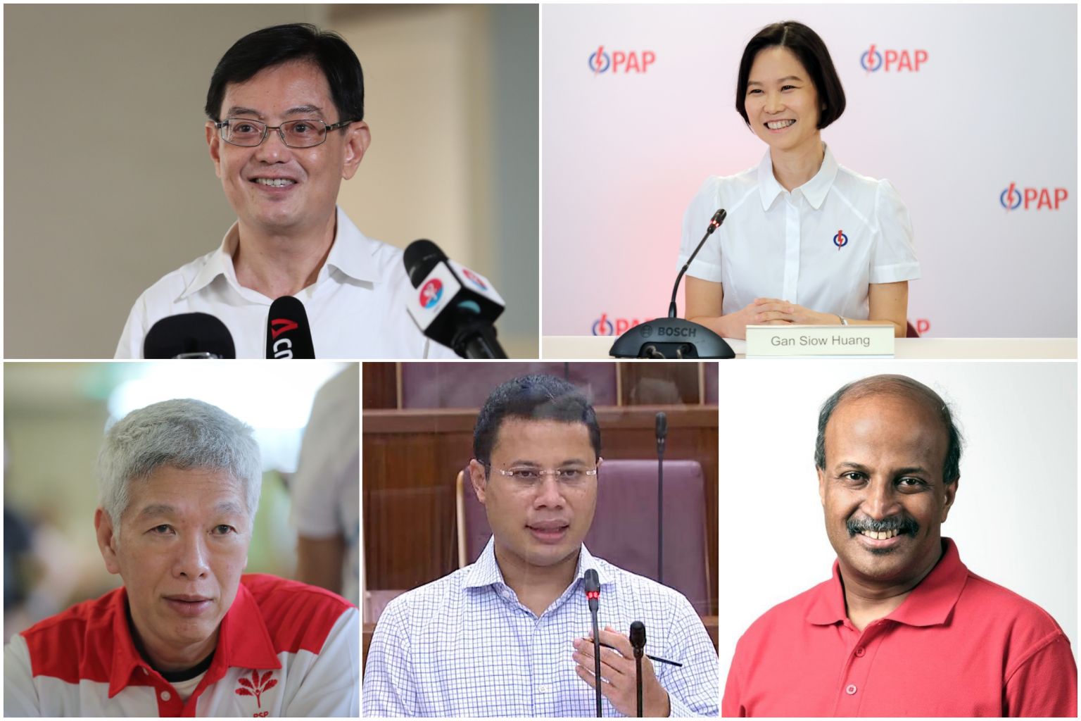(Clockwise from top left) DPM Heng Swee Keat, PAP new face Gan Siow Huang, SDP's Dr Paul Tambyah, Minister for Social and Family Development Desmond Lee and PSP's Mr Lee Hsien Yang.
