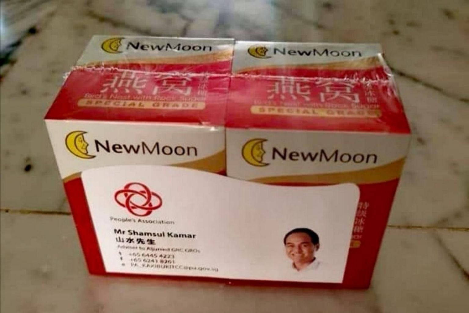 Sin Rak Sin Party Facebook page posted a picture of two bottles of bird's nest wrapped together with a PA name card bearing Mr Shamsul Kamar's name.