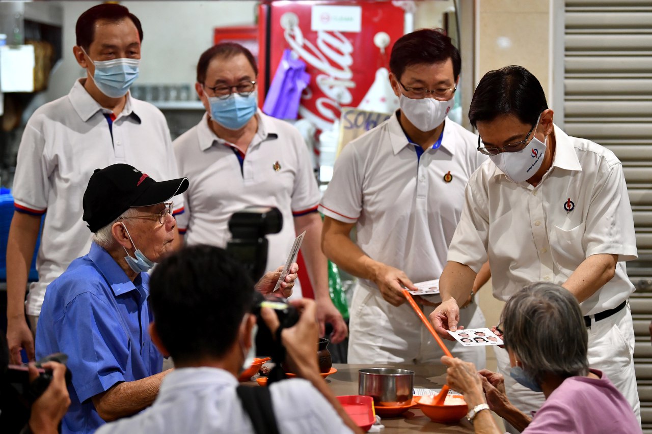 Deputy Prime Minister Heng Swee Keat (right) and MP Lee Yi Shyan (second from right) during a walkabout at Bedok Interchange Hawker Centre on June 30, 2020.