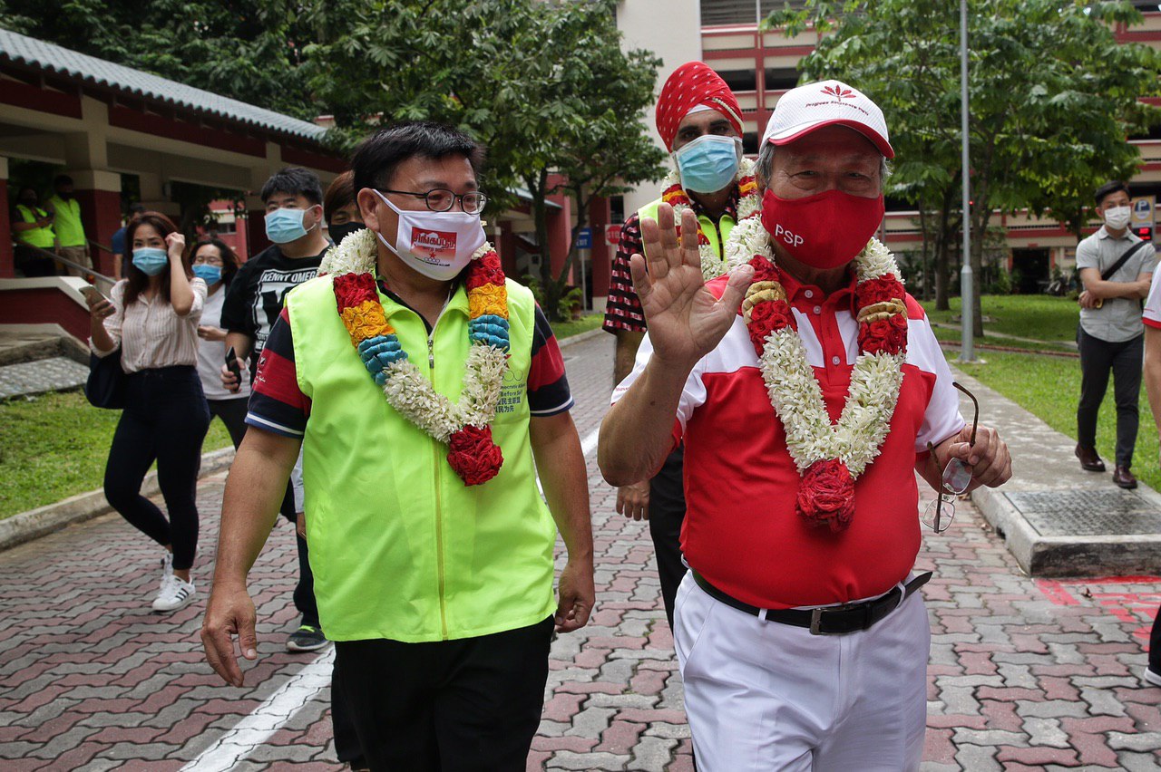 PSP chief Tan Cheng Bock joining SDA president Desmond Lim Bak Chuan on a walkabout in Pasir Ris on July 6, 2020.