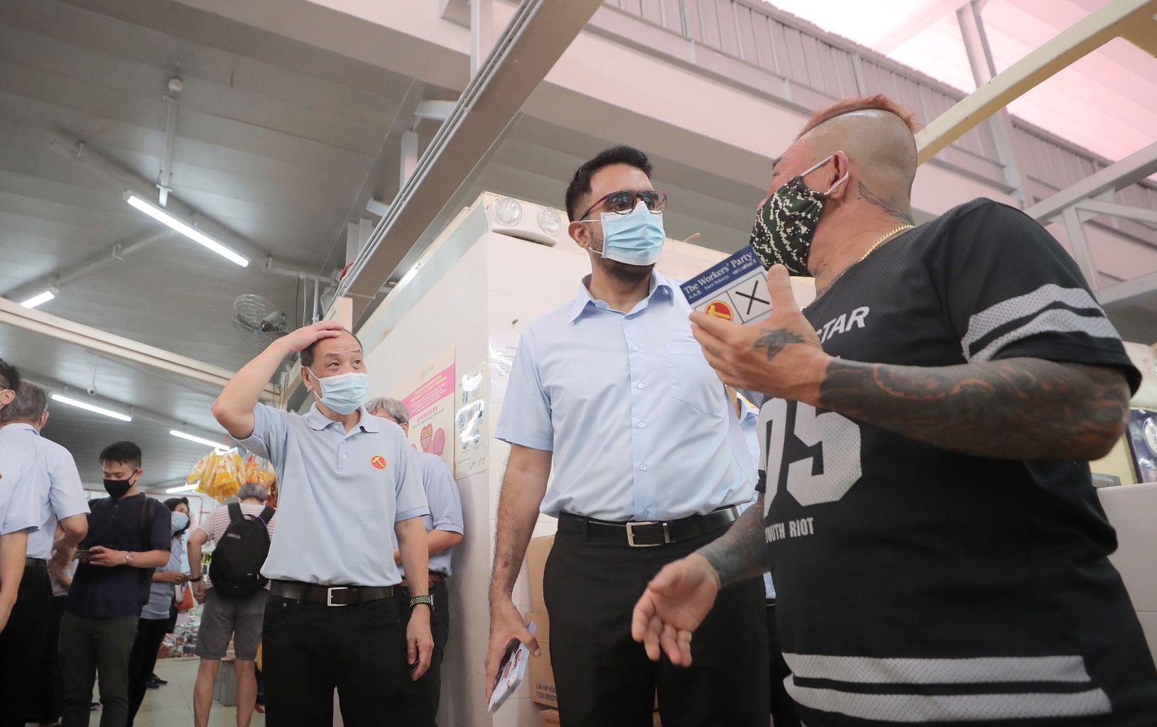 Workers' Party chief Pritam Singh (centre) talking to a resident during a walkabout at Kovan Hougang Market and Food Centre on July 2. With him is former party chief Low Thia Khiang.