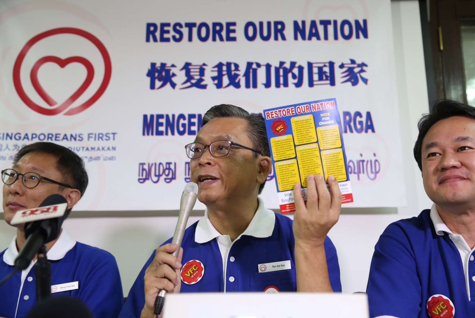 Singaporeans First Secretary-General Tan Jee Say (centre) holding up the party campaign manifesto.